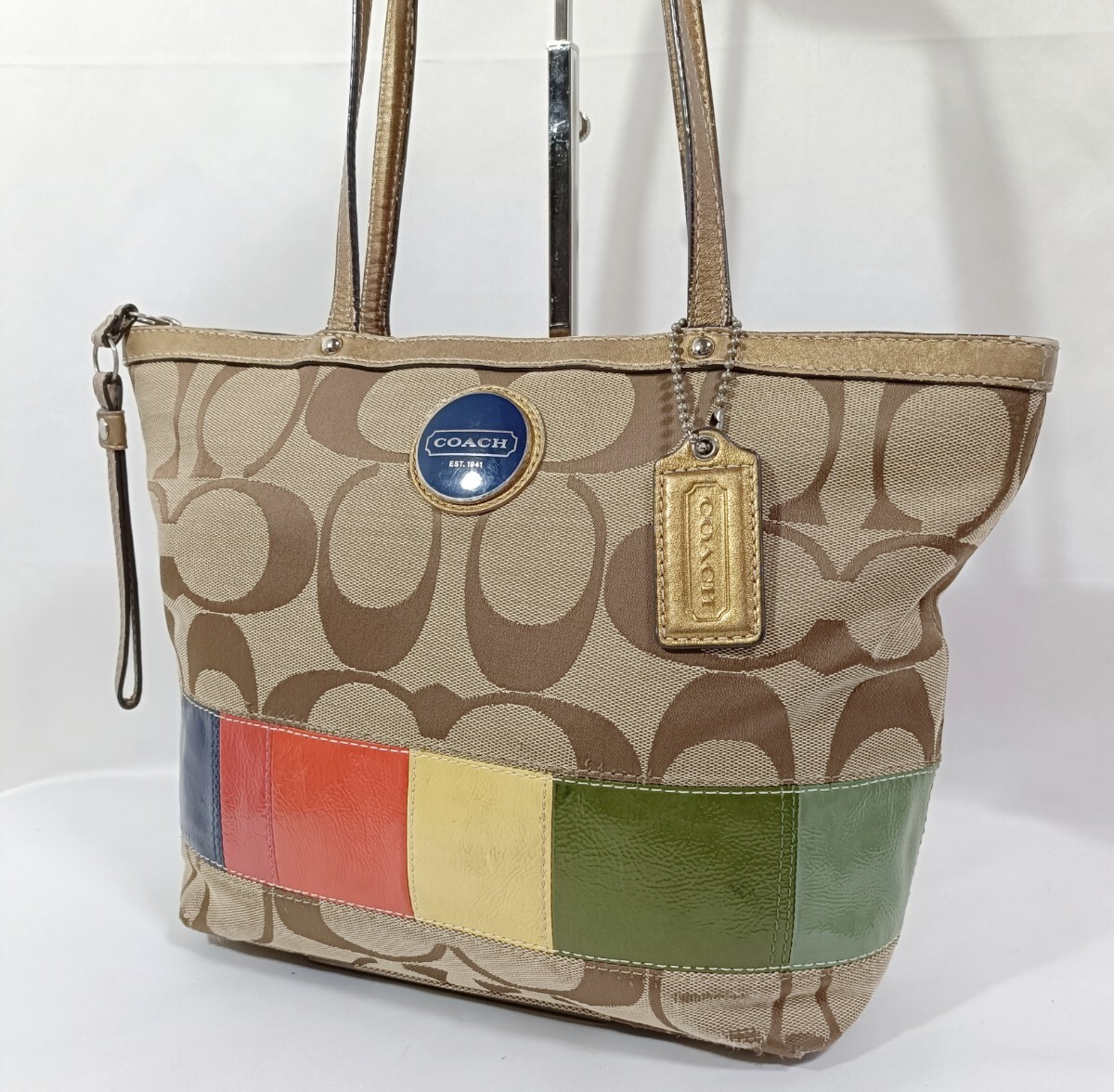 - 正規品 コーチ COACH トートバッグ シグネチャー キャンバス マルチカラー ベージュ ゴールド ハンドバッグ 肩掛け かばん 鞄 ロゴチャーム