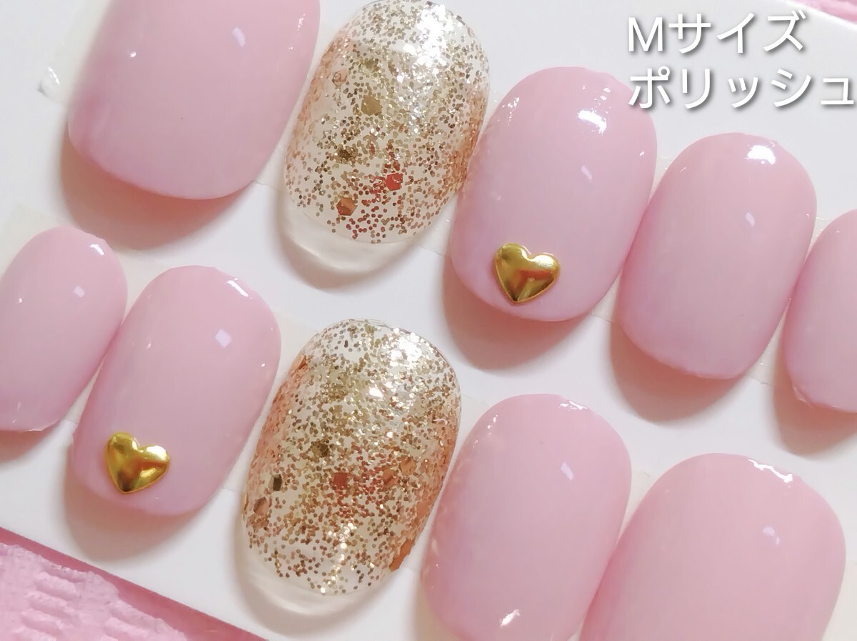 - Mサイズベリーショート・パステルピンクシンプルネイルチップハートスタッズハンドメイドゴールドラメ