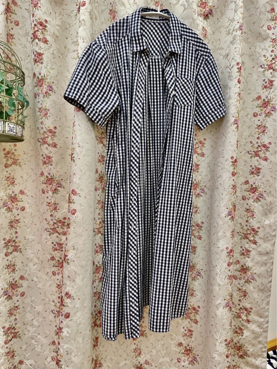 - ギンガムチェック ロングシャツ ネイビー 白 半袖