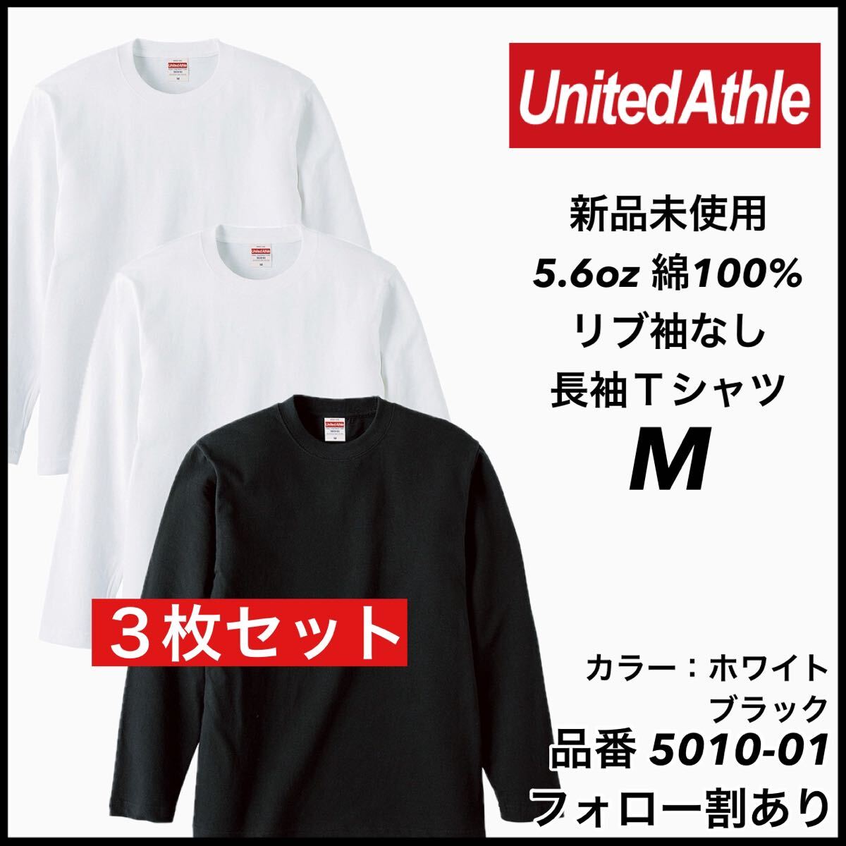 > 新品未使用 ユナイテッドアスレ United Athle 5.6oz 無地 袖リブなし 長袖Tシャツ ロンT 白黒3枚セット Mサイズ ユニセックス