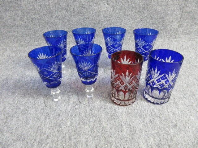 > 色被せ カット ガラス グラス 8点 [B27818] 高さ11cm/12.5cm 直径6.5cm/6.5cm 赤被せ 青被せ ワイングラス グラス コンポート 切子ガラス