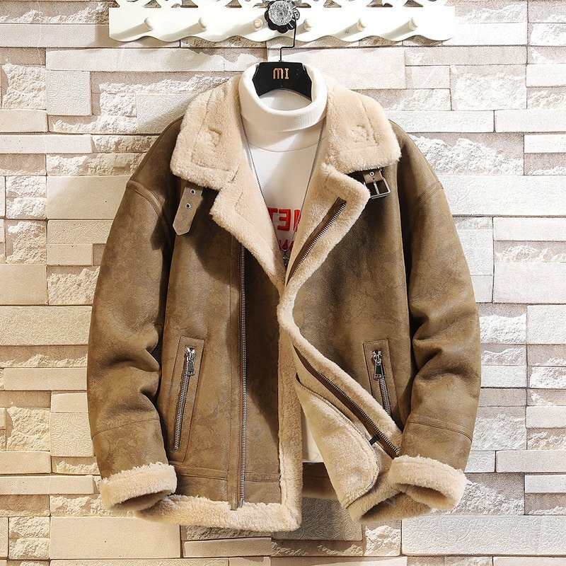 > ☆新品 ショートコート メンズ ファーコート 裏起毛防寒 厚手 アウター ライダースジャケット ブルゾン ブラウン L