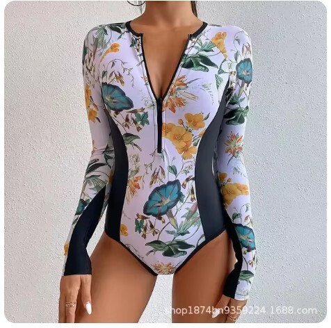 - 女性用長袖水着、サーフィン、ビーチウェア、花柄水着、プール、入浴用、色:白