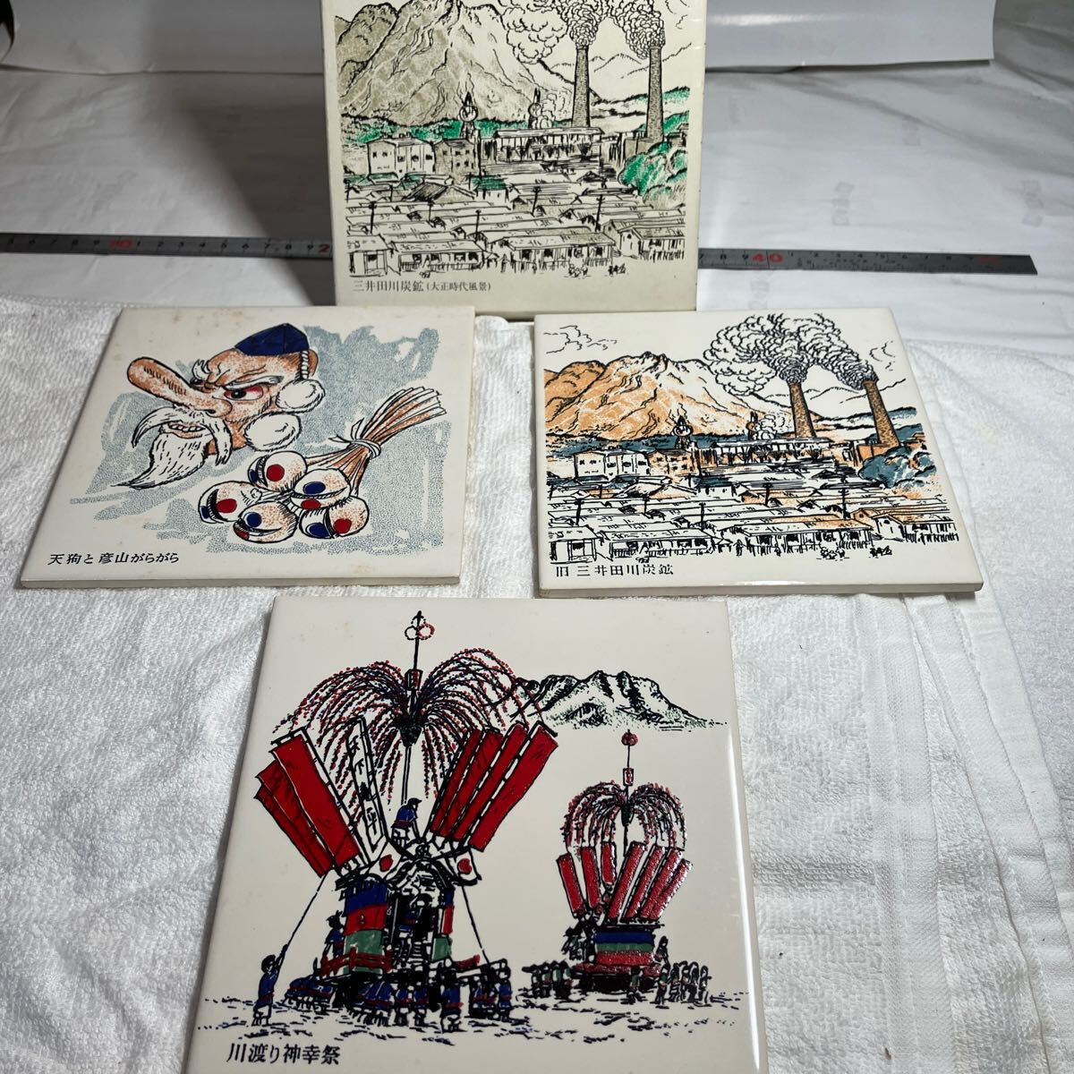 - 昭和レトロ コレクション インテリア 観光タイル 3枚 田川炭鉱 山笠 天狗 大正時代風景 送料込み