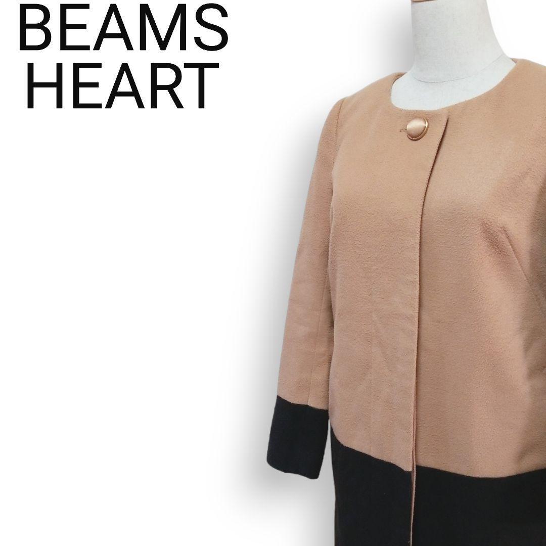- Y1683 ビームスハート BEAMS HEART ノーカラー 比翼コート ビッグボタン バイカラー ミドル丈 レディース S キャメル×ブラック 綺麗系