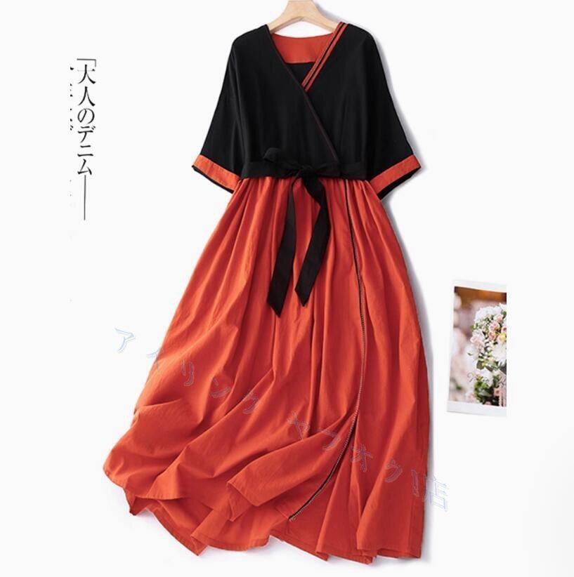 > ☆新品人気エレガント M-2XLサイズ夏 ワンピース 配色柄 カジュアル ゆったり Vネック 綿麻 半袖 体型カバー ロング丈ワンピース