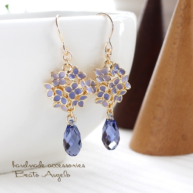 > ◇◇+angelo+K14GF スワロフスキードロップと紫陽花のピアス(p-136)タンザナイト 6010 パープル 雨 フラワーチャーム