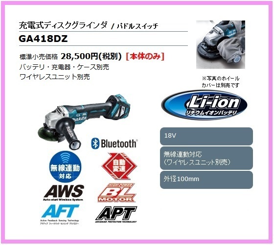 > マキタ 100mm 18V 充電式ディスクグラインダ GA418DZ (本体のみ) [パドルスイッチ] 【ワイヤレスユニット別売】 ■安心のマキタ純正/新品■