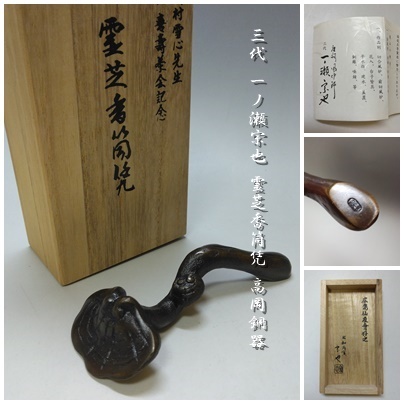 - 【S-134】三代 一ノ瀬宗也 霊芝香筒凭 香筒置き 高岡銅器 共箱付 茶道具