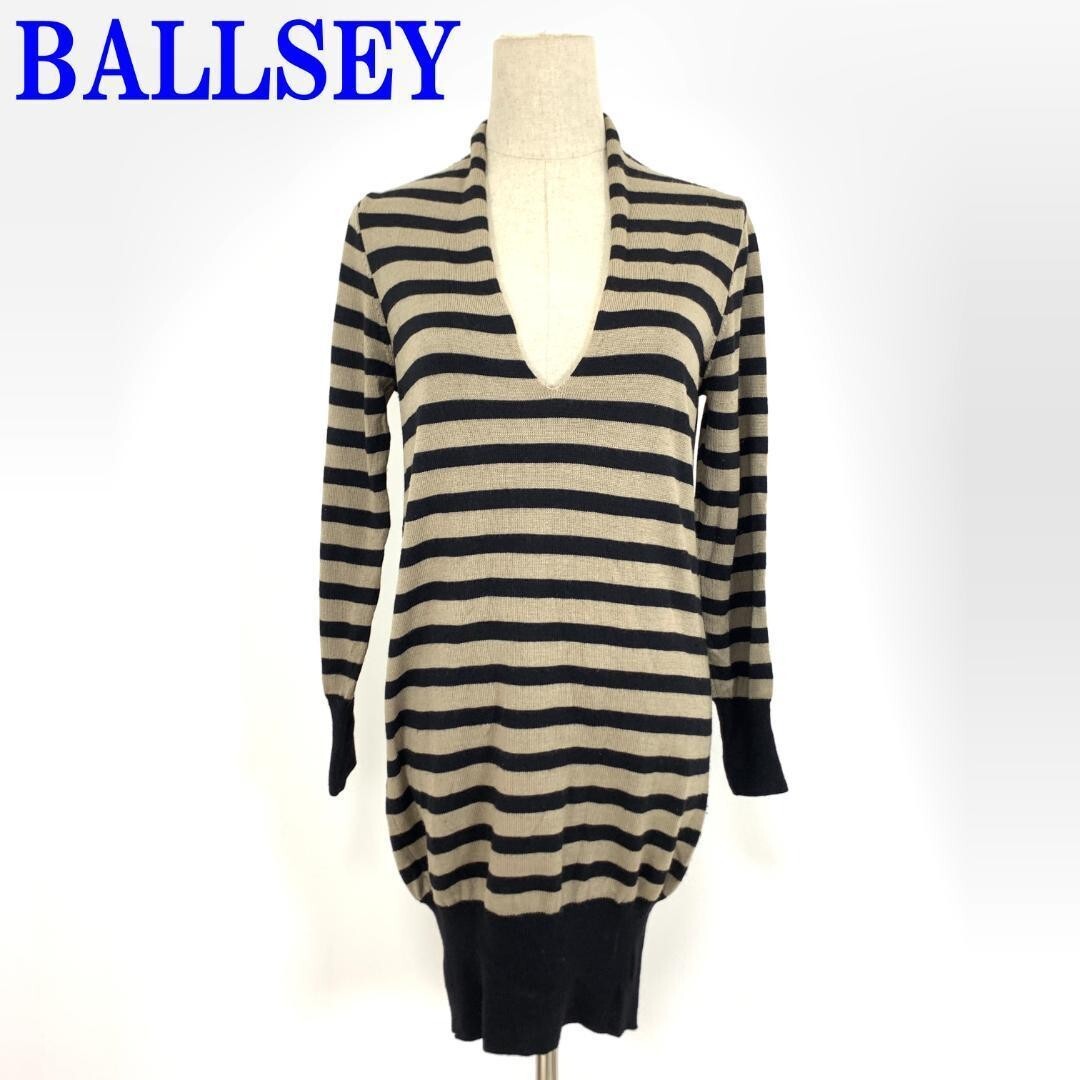 - ボールジィ ニットワンピース ウール シルクBALLSEY チュニック ひざ丈 ブラック ボーダー 黒 グレー 38 C1546