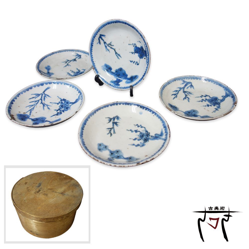 - 【中古】M▽古染付 古染 ホツ 欠けあり 割れ無 皿 小皿 5枚揃 5客 合わせ箱付 (K 00344)