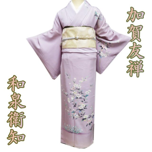 > 特選 訪問着 着物 中古 袷 フォーマル 本加賀友禅 和泉衛知 落款 花の図 ラベル付き 淡紅藤色 多色 身丈159cm 裄68cm M きもの北條 A1123-6