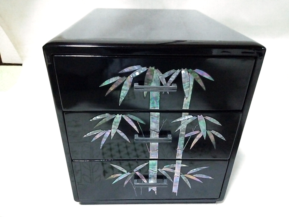 - ★【一美堂】★木製 黒塗★見事な螺鈿(貝細工) 竹紋『三段 小箪笥』★美品☆