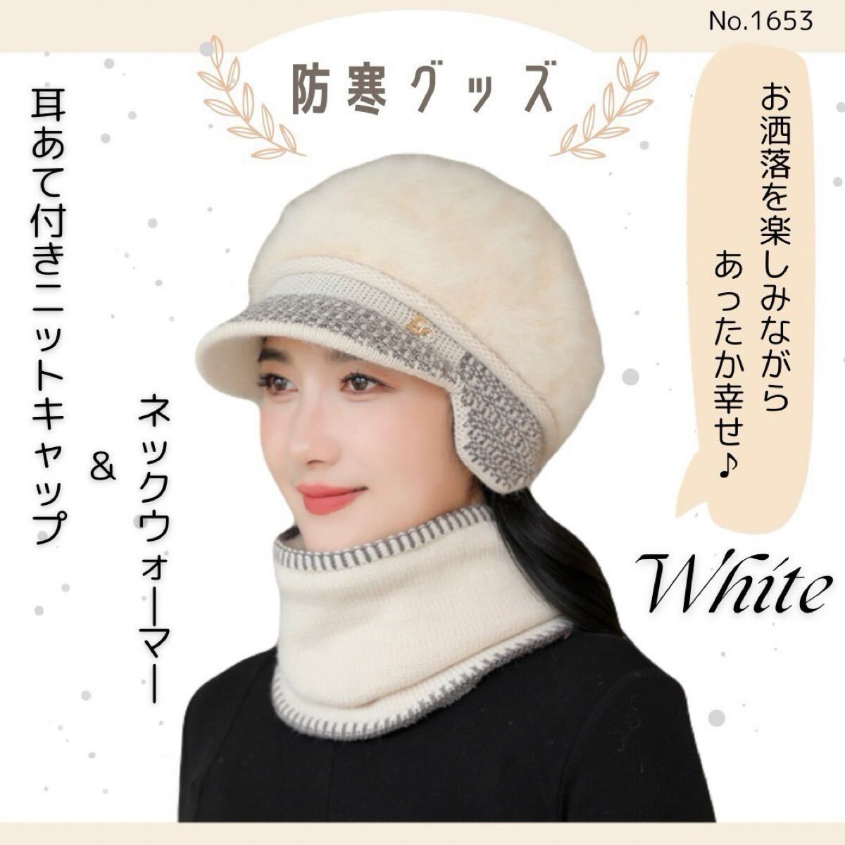- 耳あて付き ニットキャップ & ネックウォーマー ホワイト 2点セット 防寒 冬