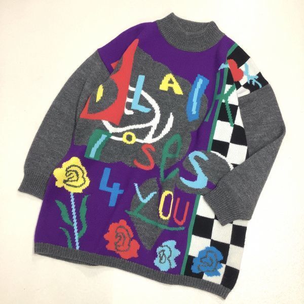 > 【抜群なデザイン】希少 美品 FINEBER ボトルネック 薔薇柄 デザインニット レディース フリーサイズ 大きいサイズ感 グレー