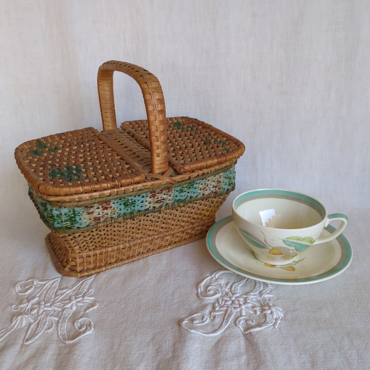 - フランスアンティーク ローズパニエ 蓋付き ローズペイントパニエ ローズバスケット ラタンバスケット バスケット パニエ ラタン 籐
