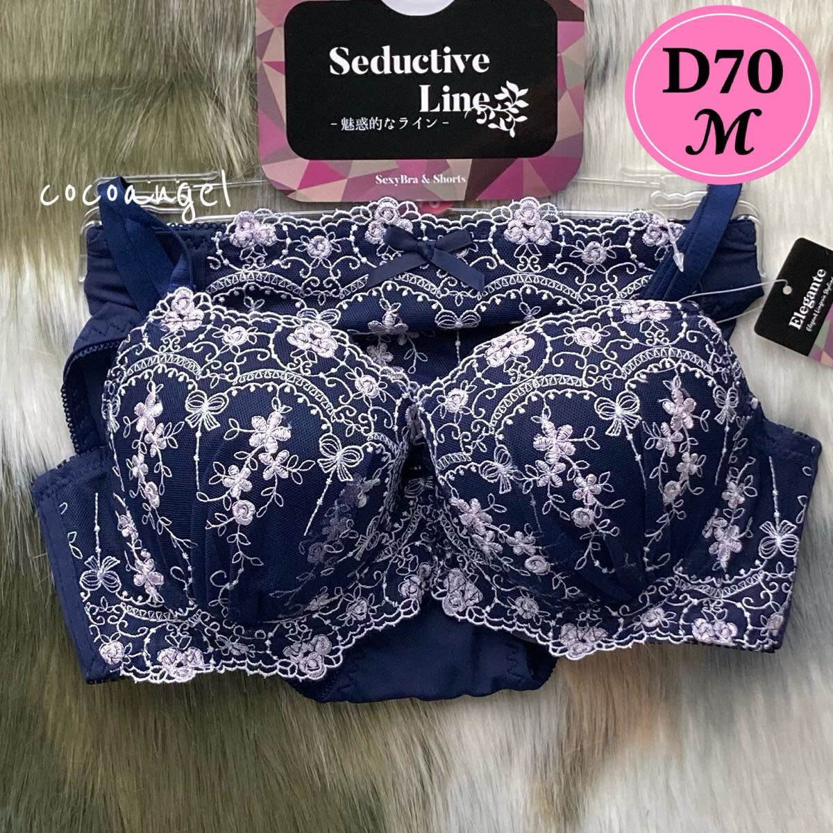 > 【D70-M ネイビー 上下セット】新品 ブラ&ショーツ ブラジャーショーツセット モールドカップ内蔵 薔薇刺しゅう バラ パンティ Dカップ