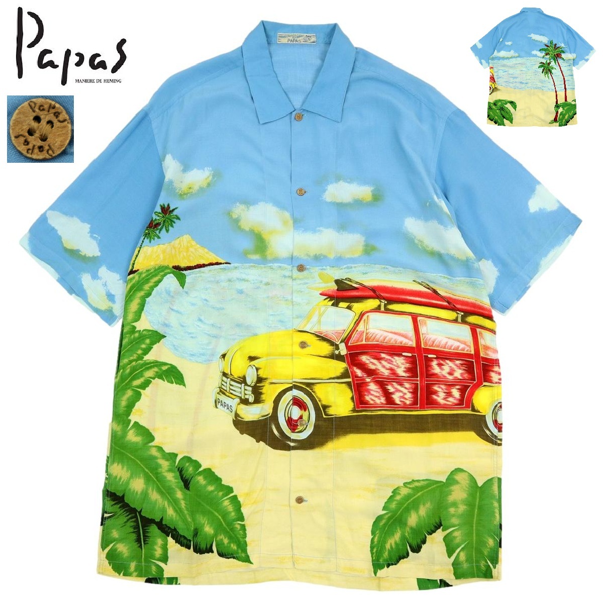 - 【Y128】【レーヨン100%】Papas パパス アロハシャツ 半袖シャツ 車 雲 ヤシの木 イエロー