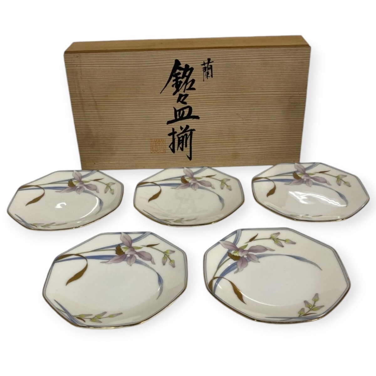 - 【未使用】 保谷謹製 HOYA ホヤ 蘭 銘々皿揃 5枚 直径13cm 木箱付き 食器 皿 24ひ106