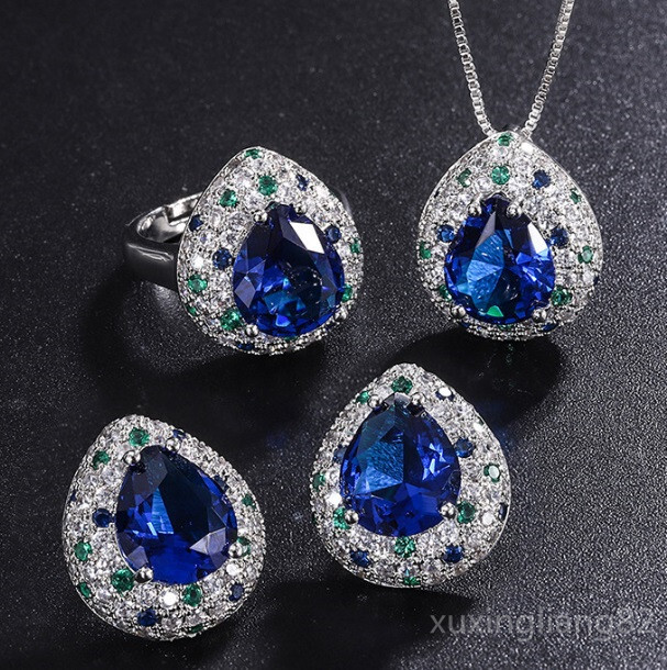 > 極美 ジュエリー3点セット サファイア ペンダントトップ ネックレス リング ピアス 満々ジルコン 真の輝く チェーン無し アクセサリー