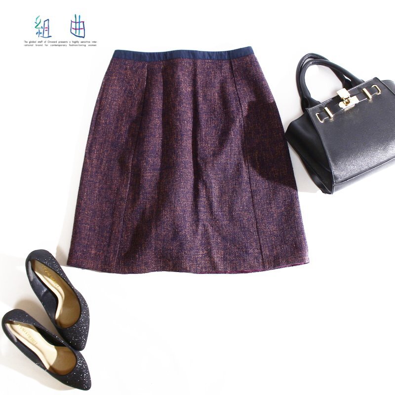- 美品 組曲 クミキョク オンワード樫山 大きいサイズ5 毛66% 膝下丈 Aライン ツイードスカート ウールスカート 15号 13号 パープル 紫