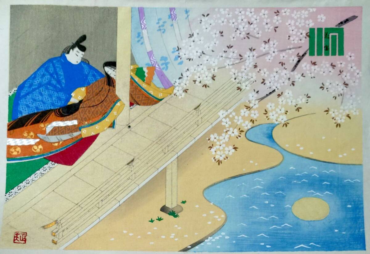 - f24121408〇彩色木版画1枚 源氏物語五十四帖 花宴 解説書付海老名正夫原画 山田書院 昭和時代〇和本古書古文書