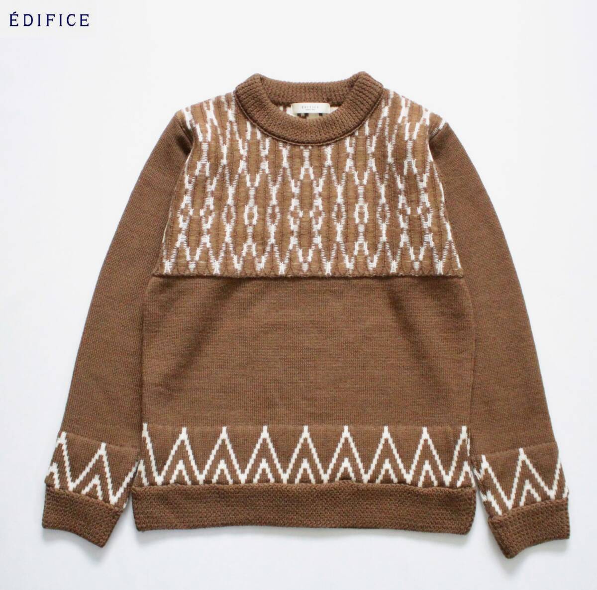 - 【 EDIFICE エディフィス 】ジャガード ノルディック ウールニット クルーネックセーター S 18-080-300-5040-3-0 定価\16,500 茶 柄