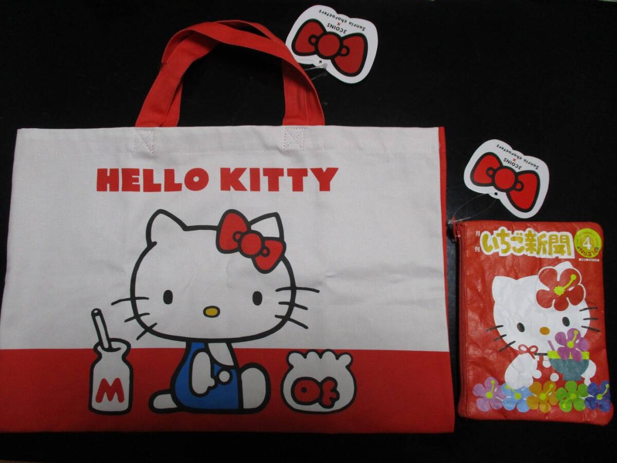 - ハローキティ いちご新聞 ポーチ 横長 トートバッグ セット スリーコインズ スリコ サンリオ