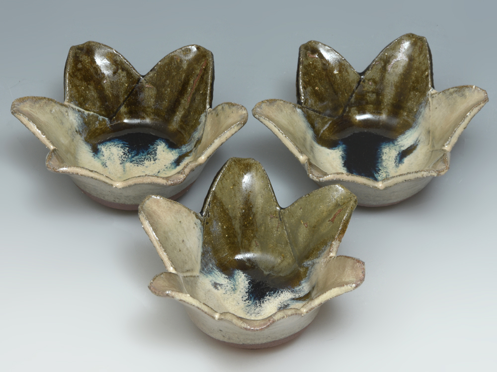 - 朝鮮唐津 割山椒 3客 向付 小鉢 懐石道具 茶懐石 料理皿 和食器 陶磁器 会席道具 在銘 作家不詳 z8776o
