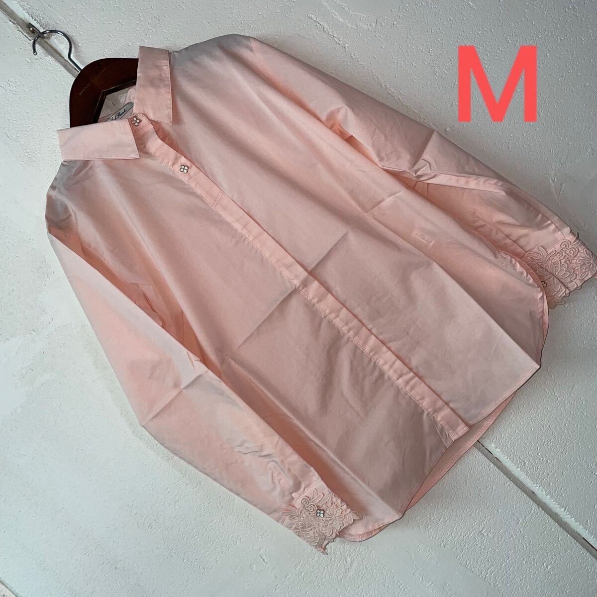 - Mサイズ花ボタンレース使いシャツ オレンジピンク