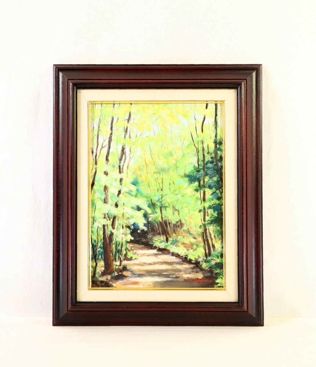 - 真作 小島一男 油彩「道」画寸 24cm×33cm F4 奈良県出身 一線美術審査員 緑豊かな森の小径 木々から差し込む光が自然の美しさ際立つ 10133