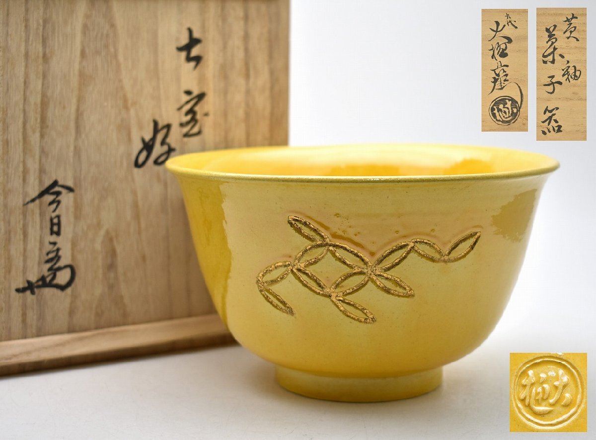 - 竜F653◆大樋焼 九代 大樋長左衛門 七宝好 黄釉 菓子鉢 菓子器 今日庵 淡々斎花押 共箱 茶道具 煎茶道具