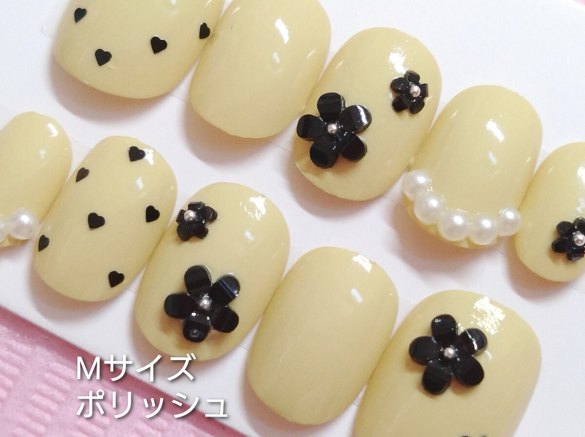 - Mサイズベリーショート・くすみイエローベース黒フラワーパーツネイルチップパールハートドット