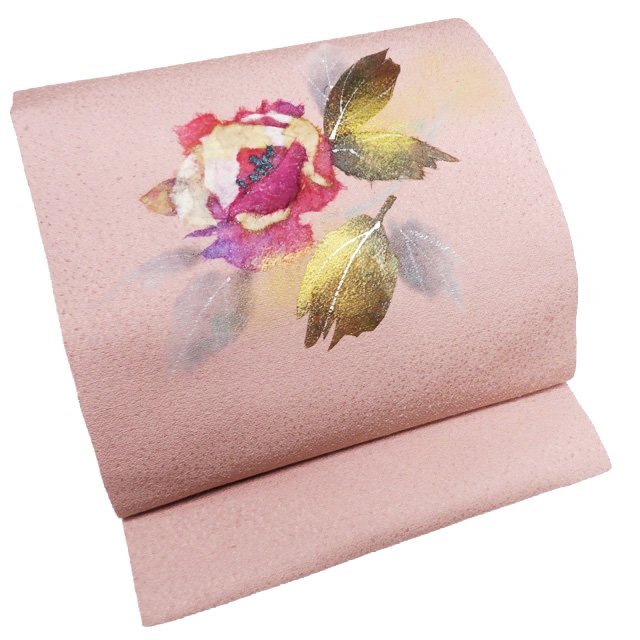 - 名古屋帯 なごや帯 中古 リサイクル 正絹 仕立て上がり 作家物 落款 和紙 ちぎり絵 薔薇の図 御所染色 多色 金 きもの北條 A1130-16