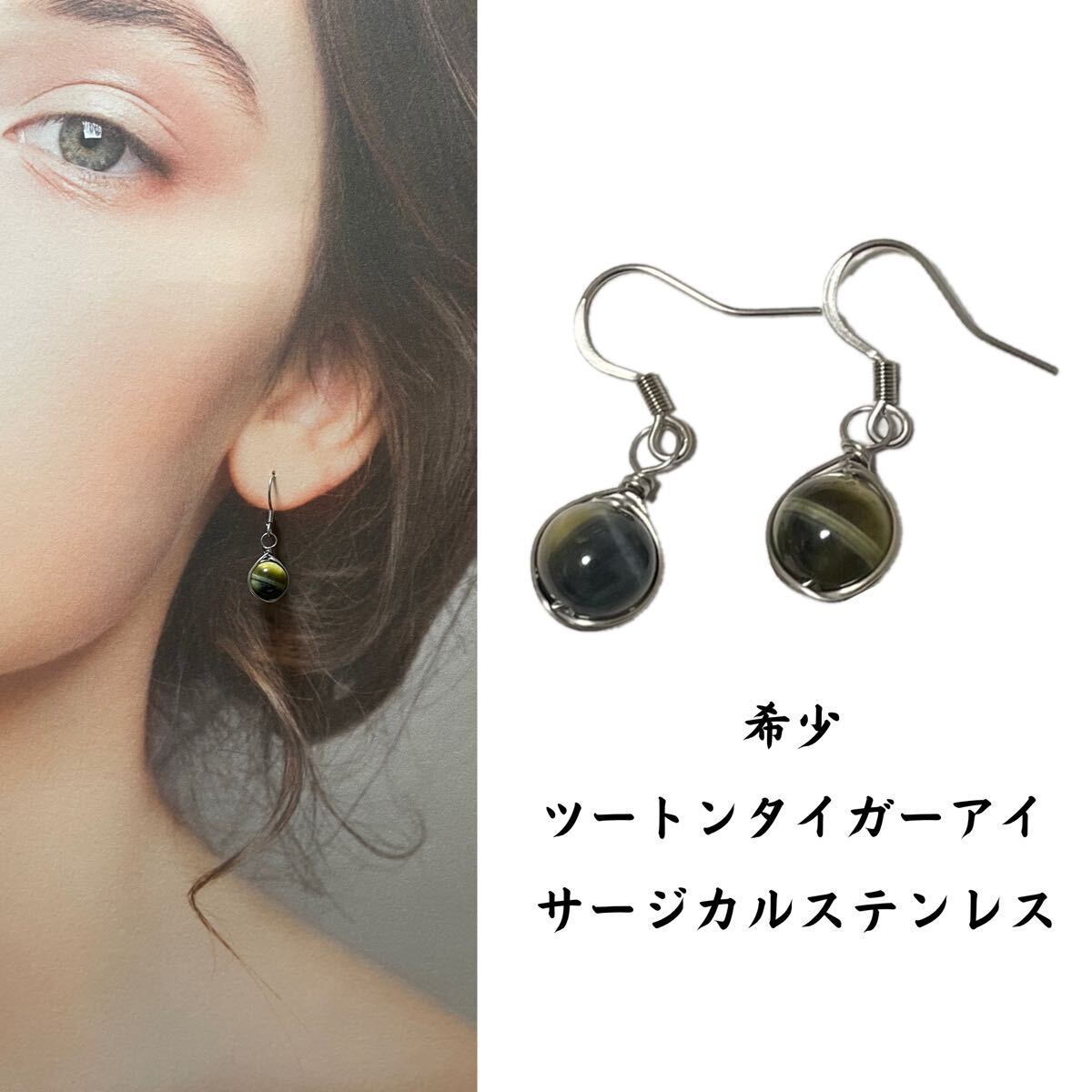 - TT4. 天然石 ピアス 希少 レアストーン ツートン タイガーアイ アレルギーフリー ニッケルフリー サージカルステンレス ハンドメイド