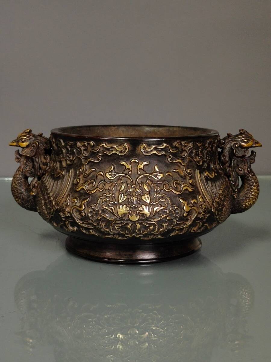 - ◆旧家蔵出◆古美術 中国古玩 大明宣徳年製款 古銅製 紫銅 塗金 高浮雕 菊花双鳳耳炉 細密細工造 置物 擺件 古賞物 時代物 A13