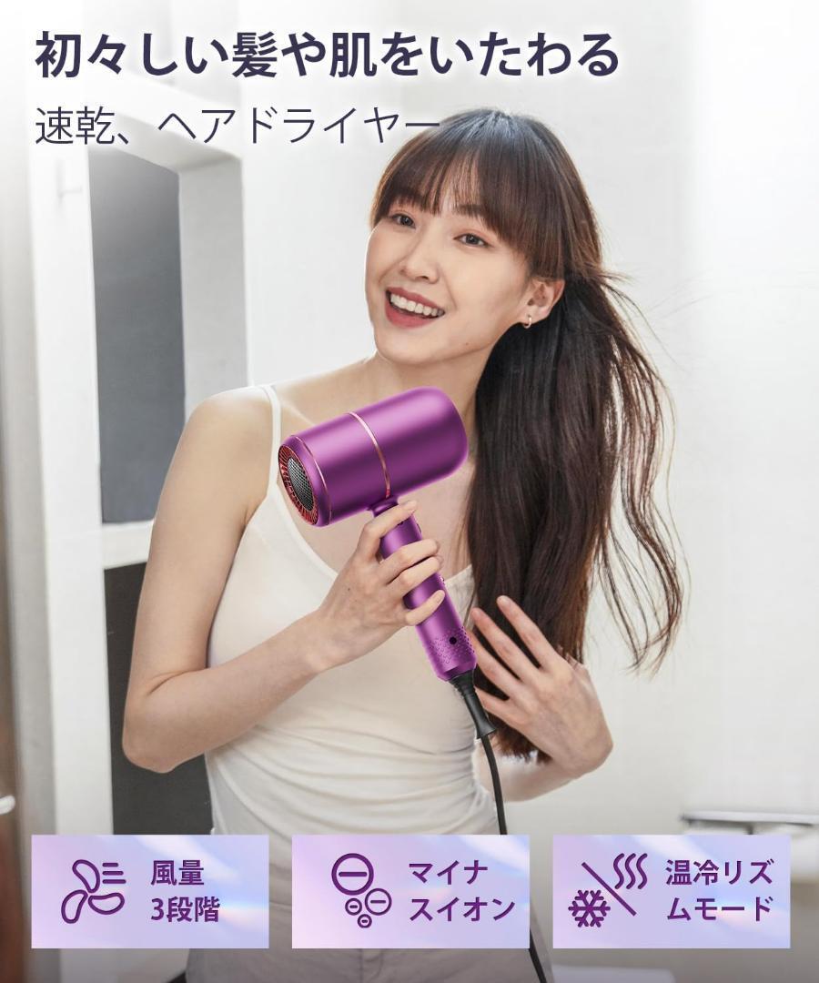 > 【速乾】ヘアドライヤー 1200W 大風量 静電気防止 マイナスイオン 風量3段階 美髪 ヘアケア 旅行 出張 美容 紫 パープル 軽量 420