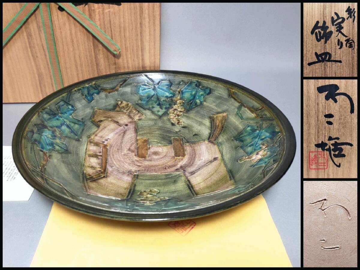 > TN27 九谷焼 巨匠 北出不二雄 (藤雄)造 彩陶 実り 飾皿 刻線馬果実文大皿 幅37㎝ 栞・共布・共箱 モダン 希少