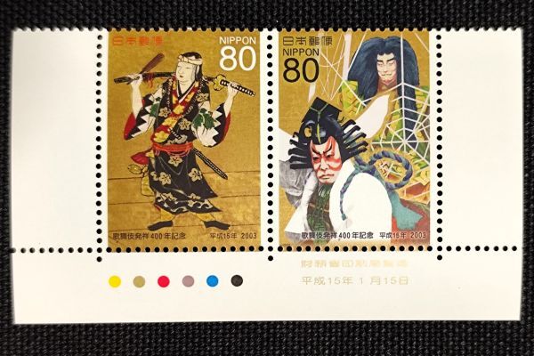 - [25010717]【歌舞伎発祥400年記念】2種連刷 銘版 CM付「阿国歌舞伎図屏風 暫と土蜘」出雲阿国 市川園十郎 尾上菊五郎 80円×2 2003年 美品*