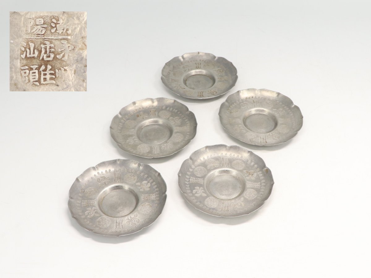 - 【蔵】中国古玩 唐物 煎茶道具 陽潮 汕店永 頭隹順 錫製 茶托 古錫 五客 時代 S2330M