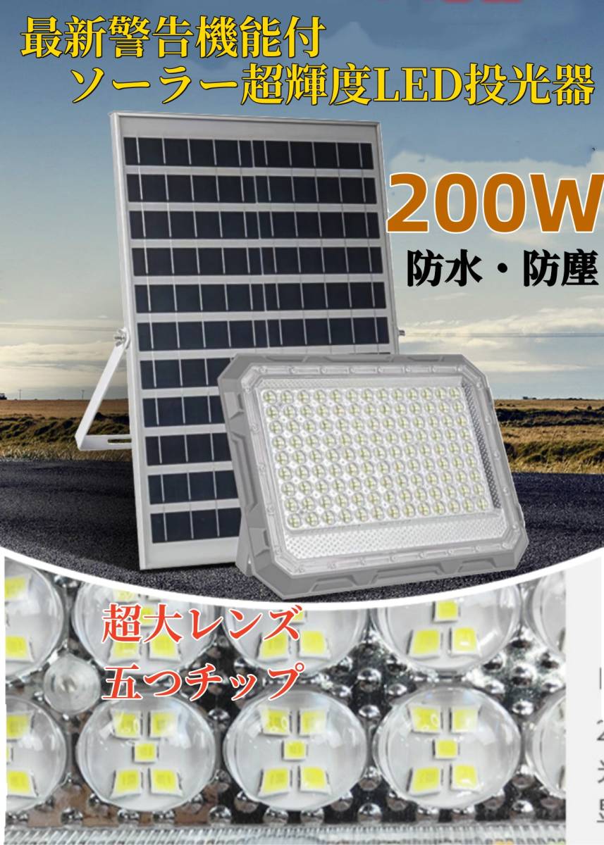 - 最新!警告機能付!ソーラーLED投光器 200W相当 385LED 「光センサー リモコン付き」調光、電量表示可!災害 停電 防犯に最適
