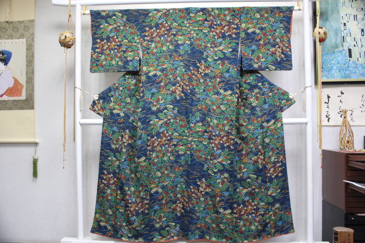> きもの今昔8065 小紋のきもの 広衿袷手縫い仕立 正絹一越ちりめん生地 紺色地野の花の柄 身丈150cm