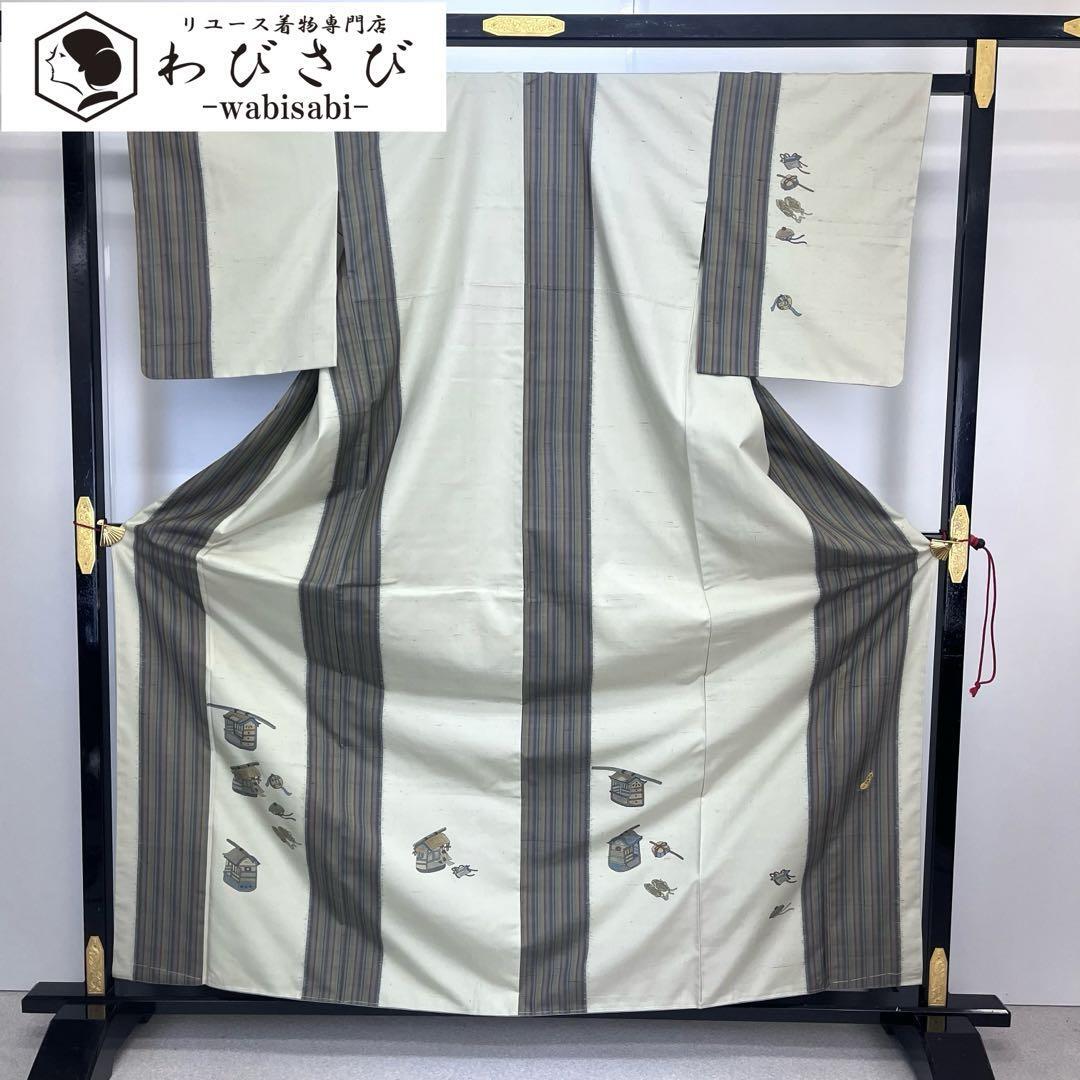 薄若葉色の落ち着いたお色味の紬地に駕籠や草履などの柄裄が手描きでデザインされた素敵なお品でございます。