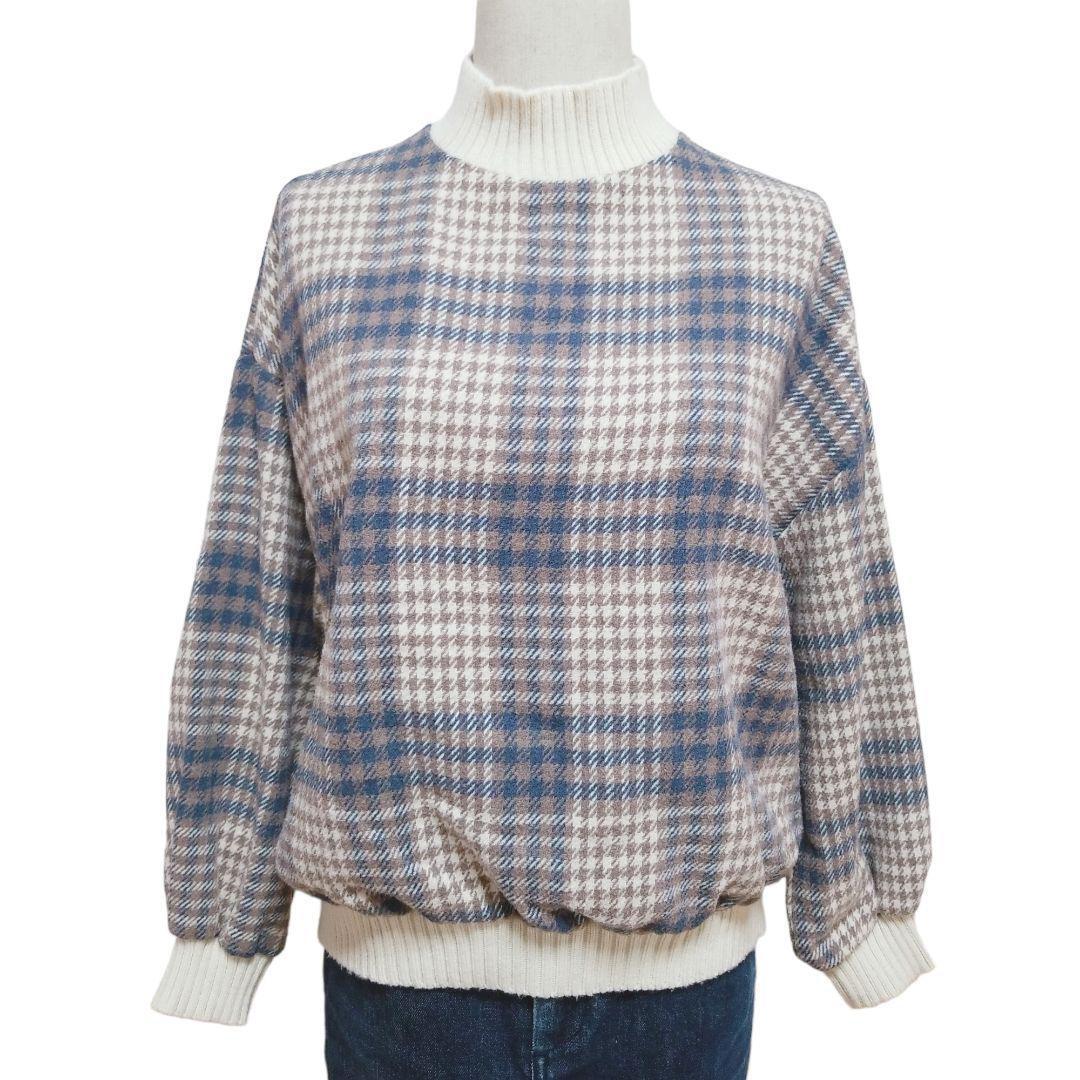 > パンプキンポート pumpkin port 異素材切替え ハイネック ニットセーター オーバーサイズ 長袖 レディース M ブラウン系 チェック柄 秋冬