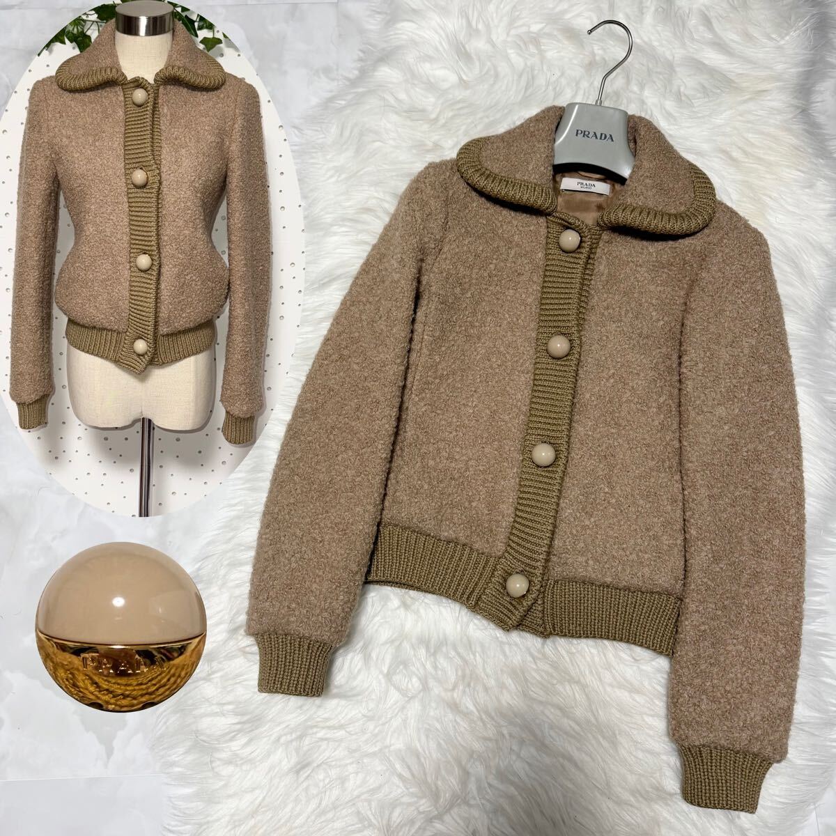 > 本物 プラダ パイピング 切替 リブ編み トリム 装飾 ボールボタン ブルゾン ニット ジャケット 36 ベージュ系 モヘア混 PRADA