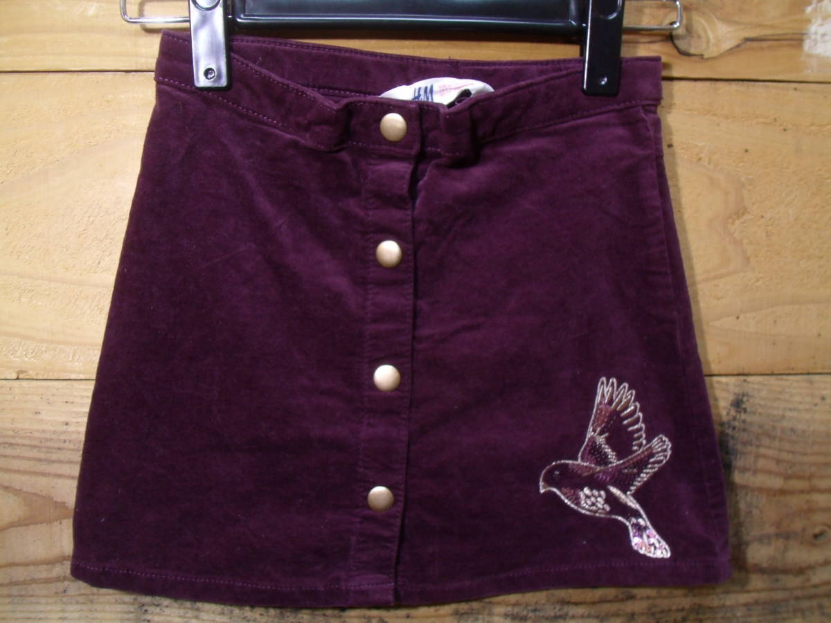 > 全国送料無料 エイチアンドエム H&M 子供服キッズ女の子秋冬物ベロア素材ワイン色鳥刺繍入りスカート 120 着丈30cm
