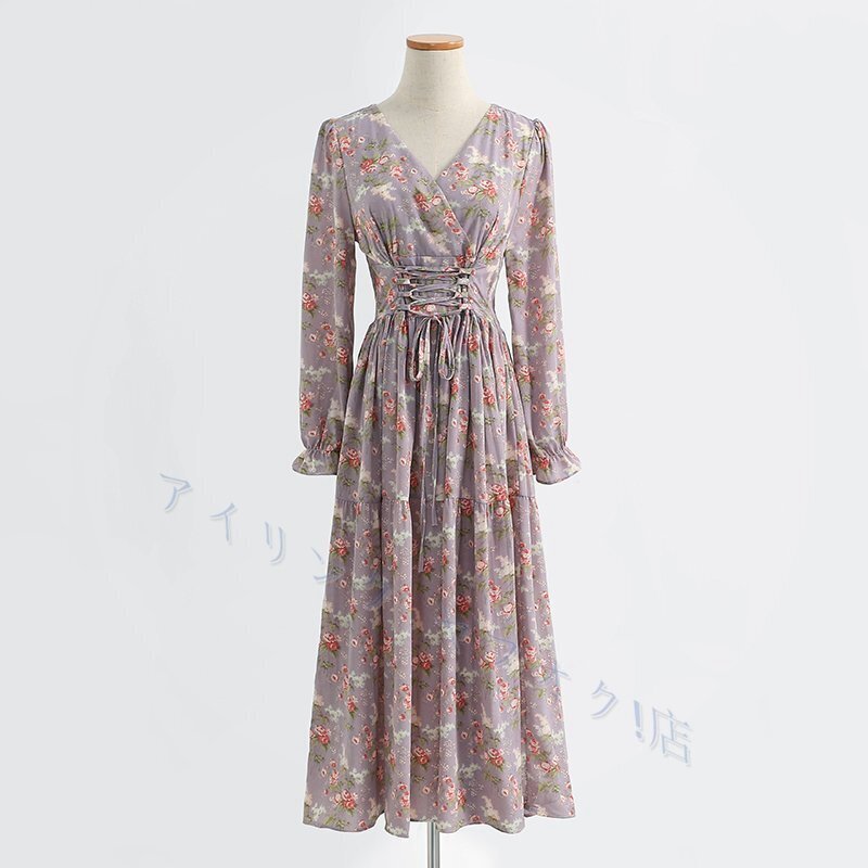 > 新品 シフォンワンピース 花柄 ワンピース ロングドレス フリル 長袖 Vネック プリント レディース 爽やか 程良い透け感 春夏秋パープル