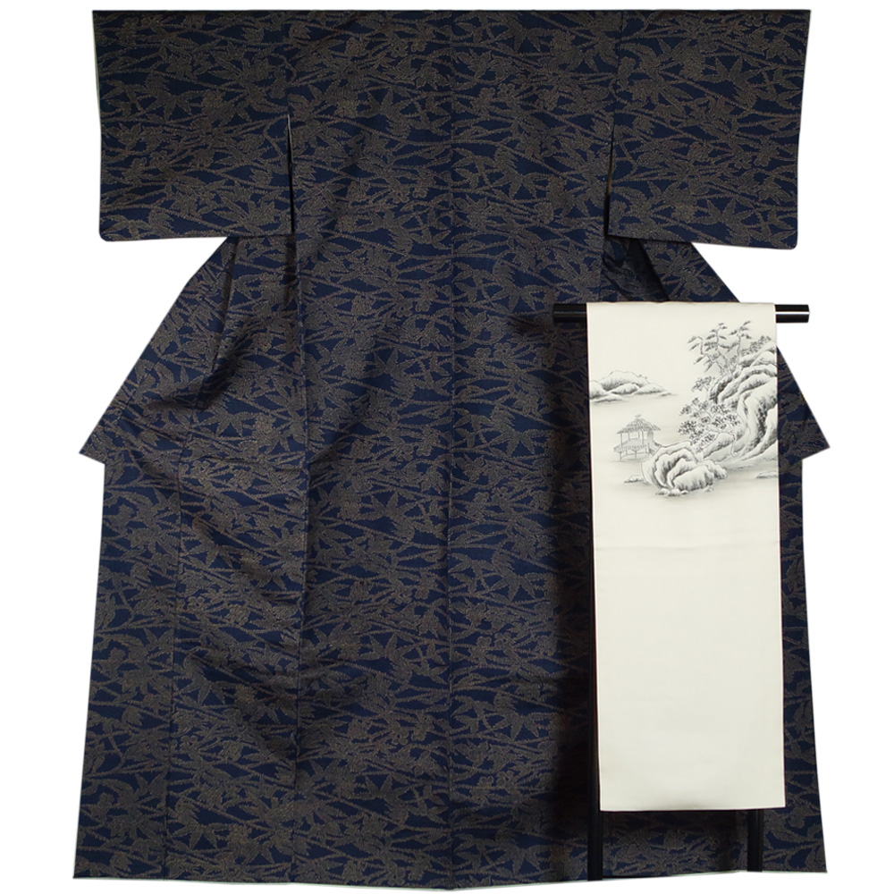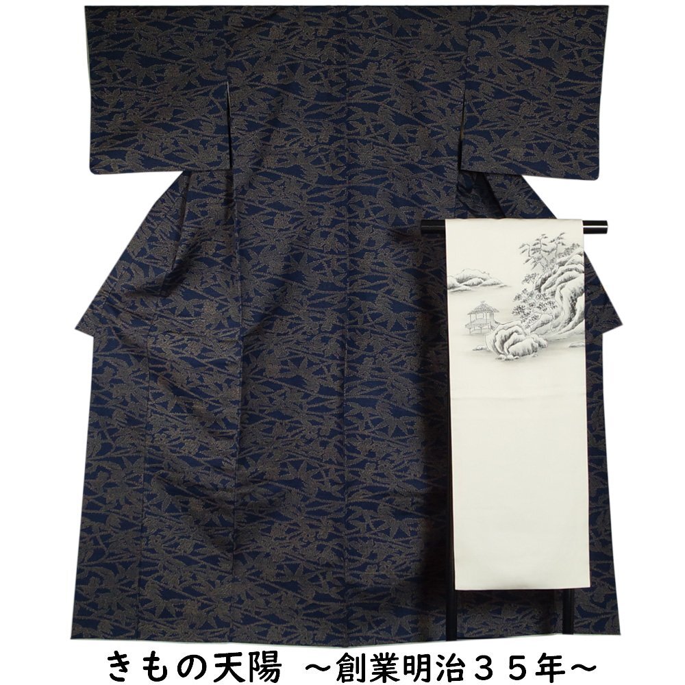 - 着物セット 紬・塩瀬 名古屋帯 2点 セット 梅・笹・楓模様 Sサイズ 紬 中古 着物 リサイクル着物 リサイクル紬 正絹 きもの天陽
