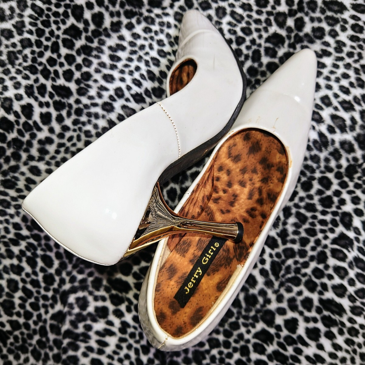 > ギャル系・キャバ嬢・エナメルパンプス白・ピンヒール・美脚・ポインテッドトゥ・爪先尖り・ハイヒール・整理品・中古・使用感あり・愛用品