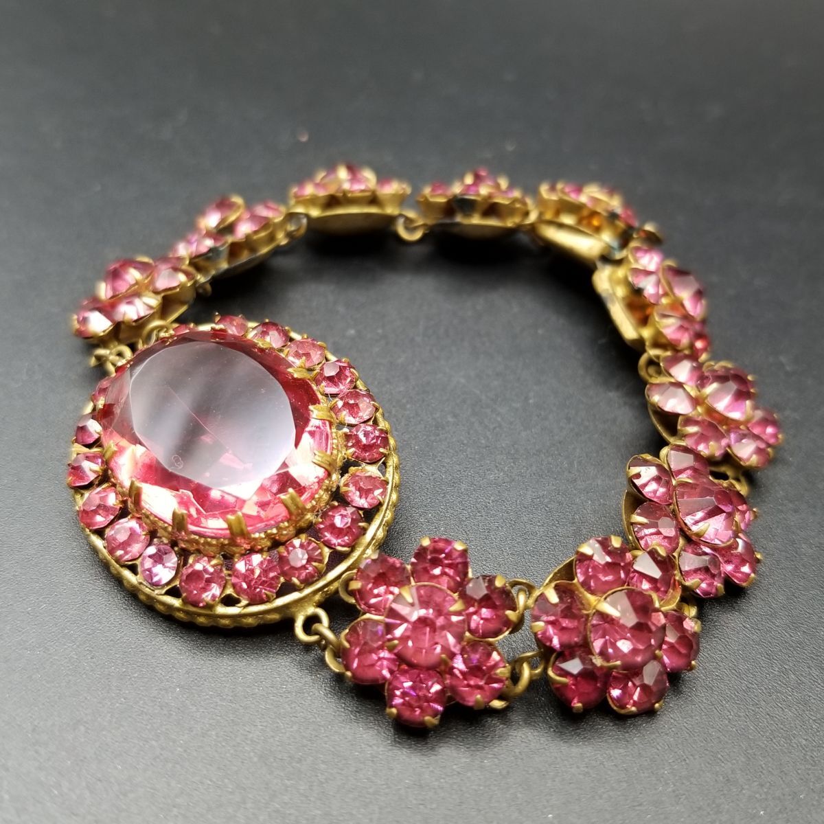 - 20'30's頃 チェコスロバキア ヴィンテージ 煌びやか ピンク チェコガラス フラワー ブレスレット 花モチーフ 真鍮製 Czechoslovakia Y21-C